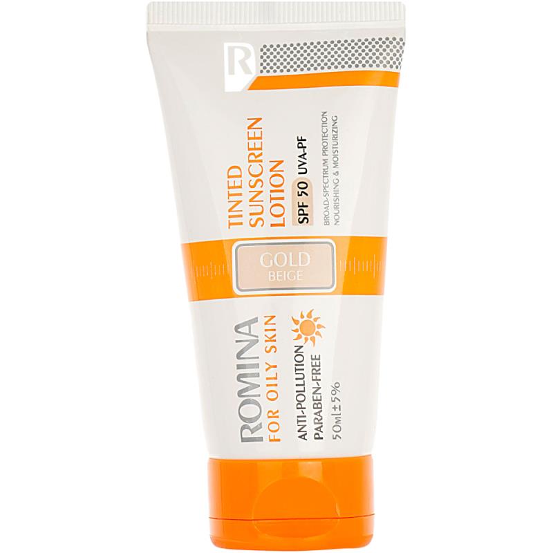 لوسیون ضد آفتاب رومینا بژ طلایی مناسب برای پوست چرب SPF50 ظرفیت 50 میلی لیتر