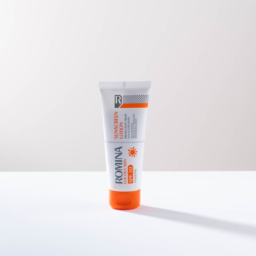 لوسیون ضد آفتاب رومینا بی رنگ مناسب برای پوست چرب SPF 50 ظرفیت 75 میلی لیتر